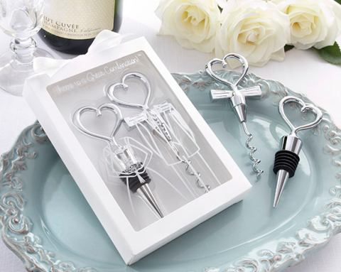 Bottle stopper with a heart-shaped top and corkscrew with a heart-shaped top and "tuxedo tie" are a great combination. This whimsical wine set is a unique and heartwarming way for your guests to remember your special day. Solid chrome bottle stopper and corkscrew are presented in a gift box with a velvet-like interior and clear cover with a playful bride and groom design.
